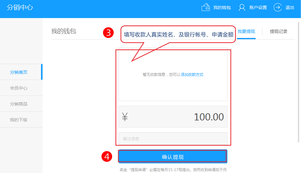 2.用戶在 用戶中心-》分銷中心-》提現(xiàn)申請 -》填寫銀行帳號和收款人真實(shí)姓名管理員審核通過后通過網(wǎng)銀支付給分銷商
