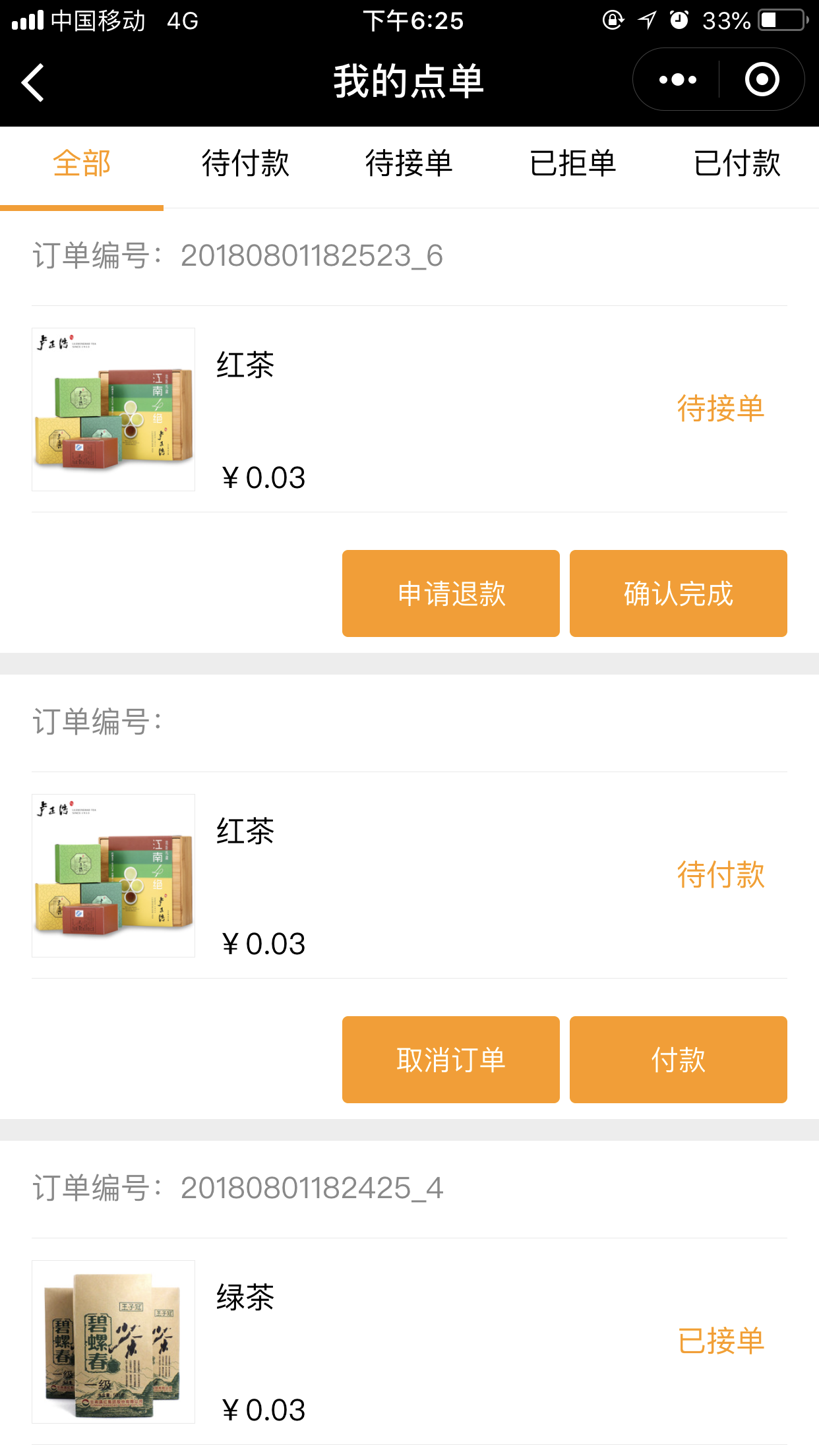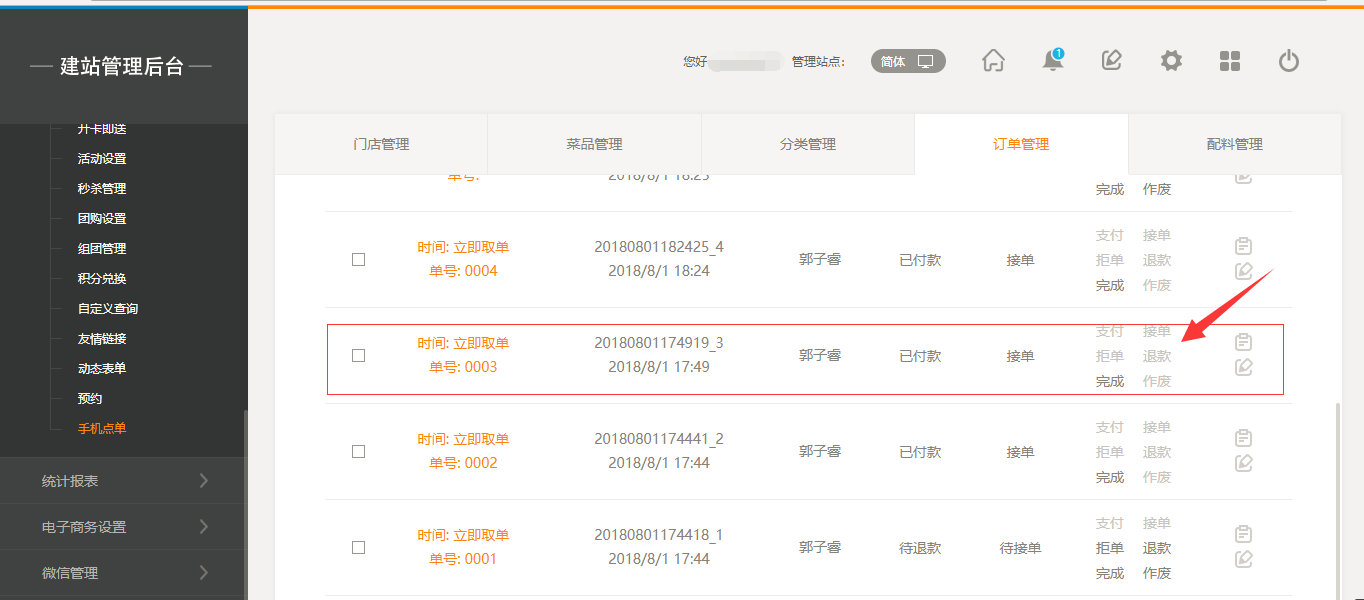 6.在后臺“訂單管理”中,當(dāng)商家已經(jīng)接單后,前臺用戶則不能申請“退款”,如果商家沒有接單,則用戶可以進行“申請退款操作”,如圖所示: