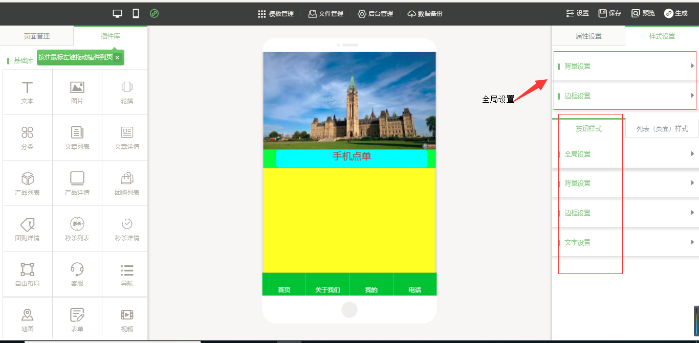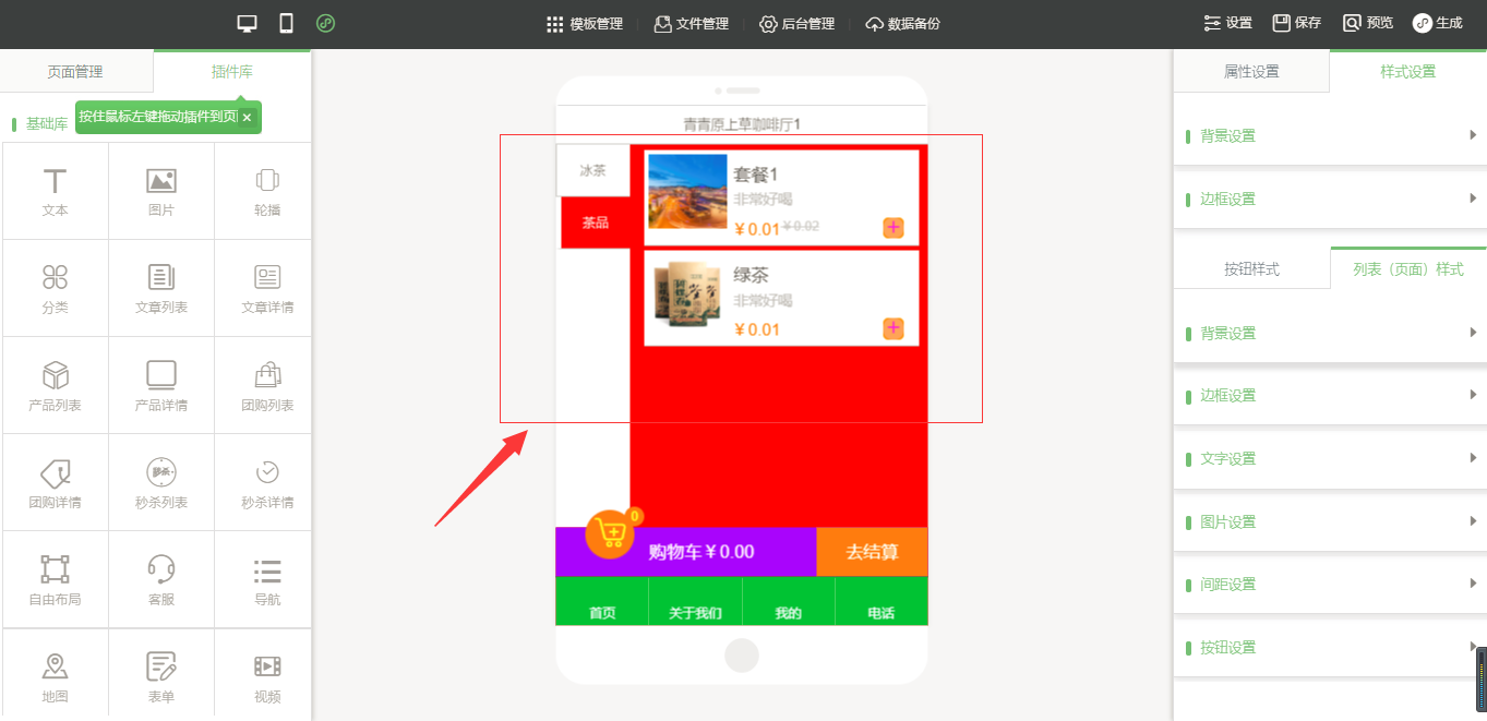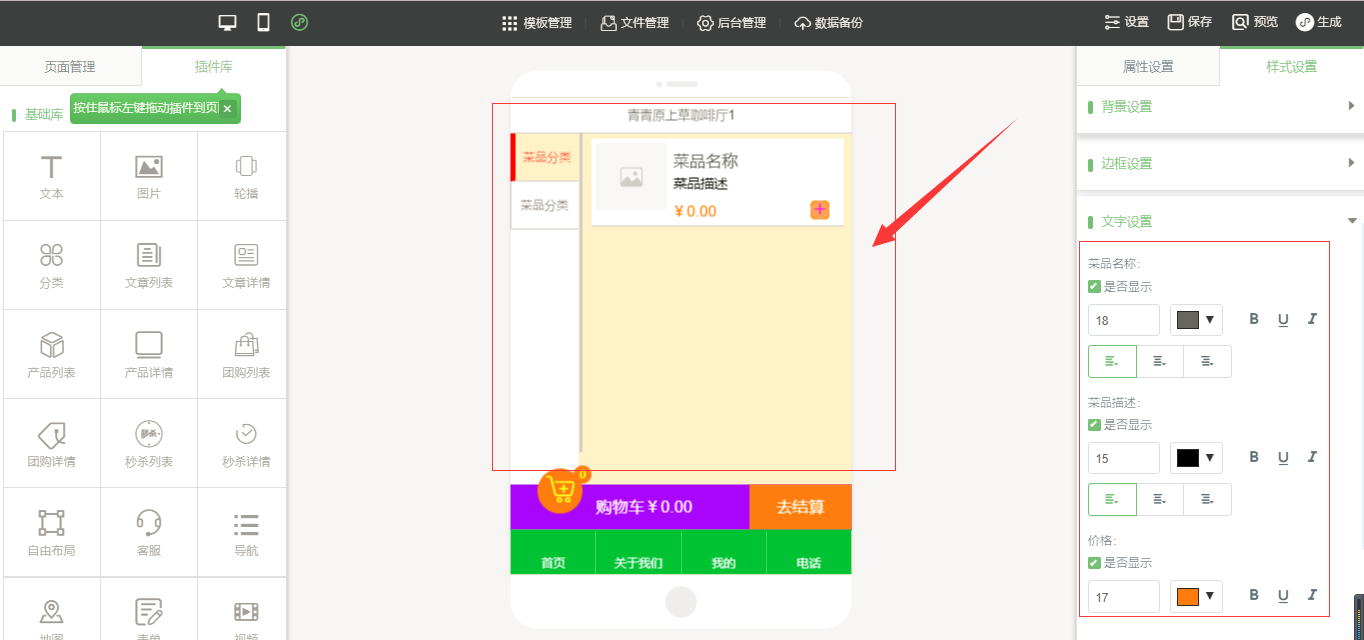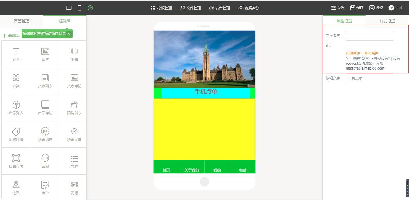 3.在小程序編輯器中,拖入插件“手機點單”,該插件為內(nèi)頁插件,我們可以在頁面中給小程序頁面進行布局,然后點擊“開始點單”按鈕進行屬性及樣式設(shè)置,由于需要店面的準(zhǔn)確定位,因此需要申請地圖的API密鑰,具體操作可以看幫助文檔,在樣式設(shè)置中,“背景設(shè)置”與“邊框設(shè)置”是全局設(shè)置,是針對該小程序插件頁面的整體設(shè)置,“按鈕樣式”則是僅針對于“手機點單”入口按鈕的設(shè)置;“列表(頁面)設(shè)置”是針對該菜品列表頁的設(shè)置,里面的“文字設(shè)置”中可以設(shè)置需要的顯示項,設(shè)置完成之后點擊保存即可(注:當(dāng)后臺沒有添加任何數(shù)據(jù)時,該列表頁中會出現(xiàn)一組假的數(shù)據(jù),僅供參考使用,當(dāng)后臺添加數(shù)據(jù)之后,該列表會自動換成真實數(shù)據(jù)),如圖所示: