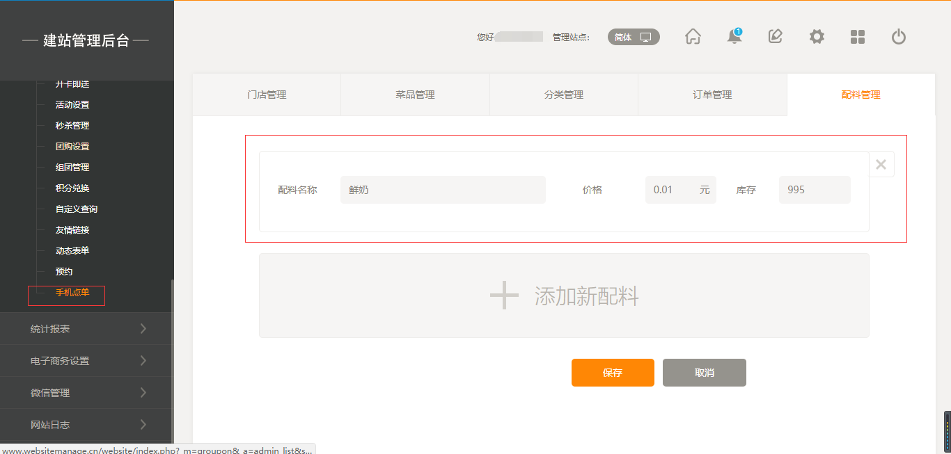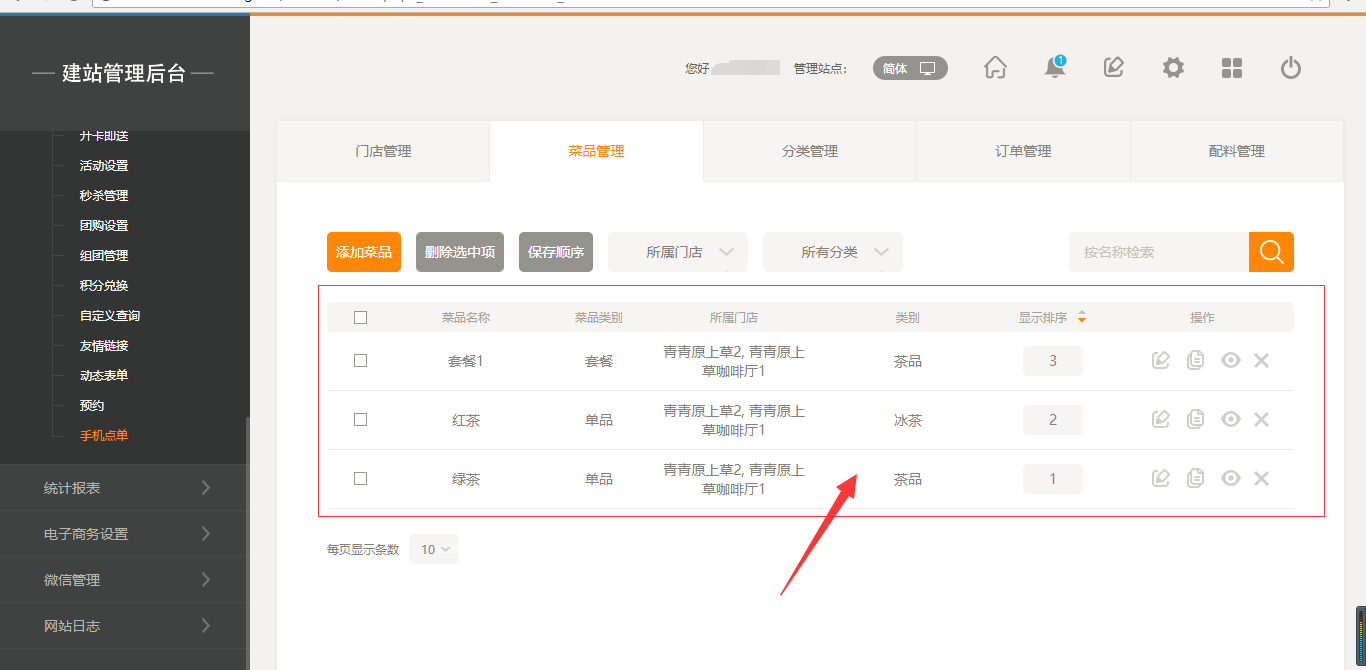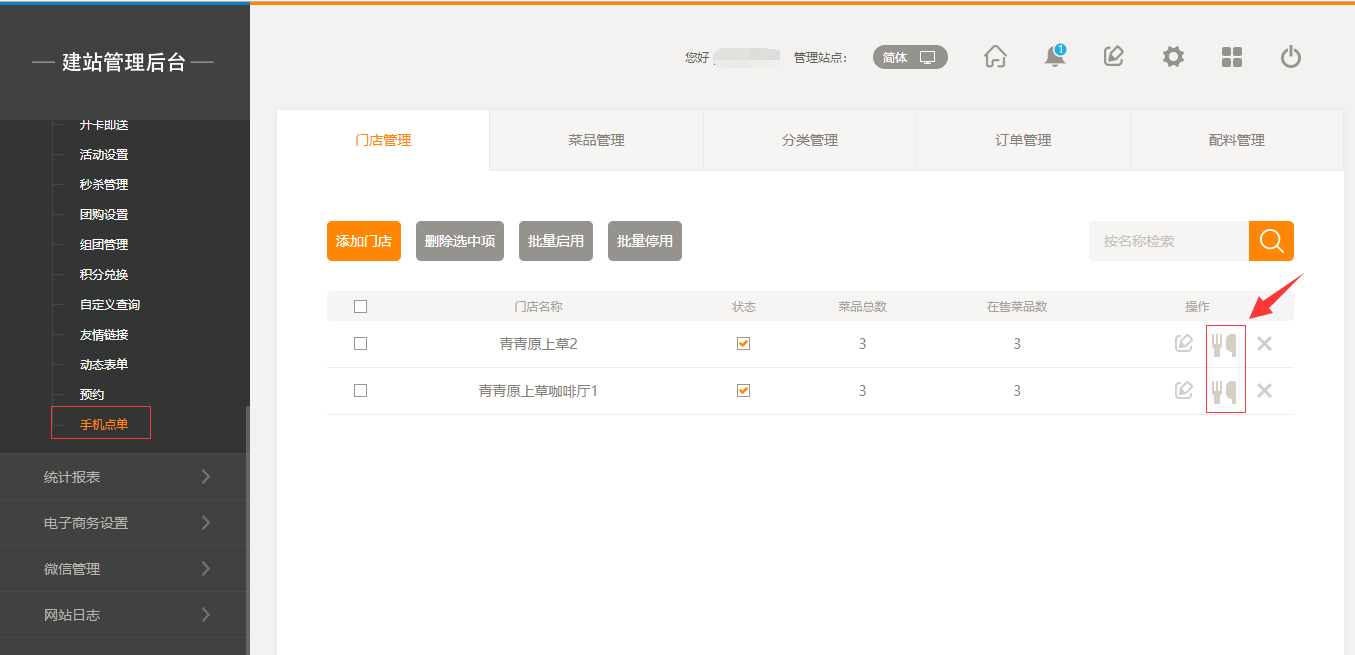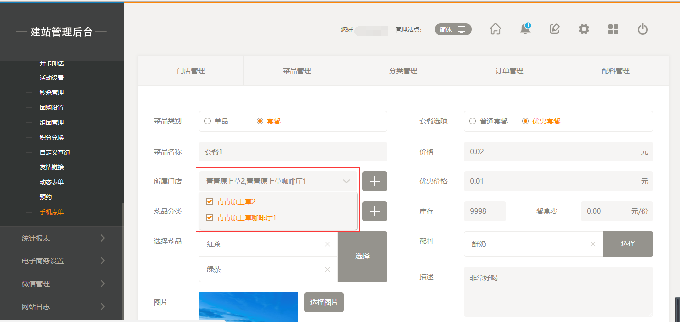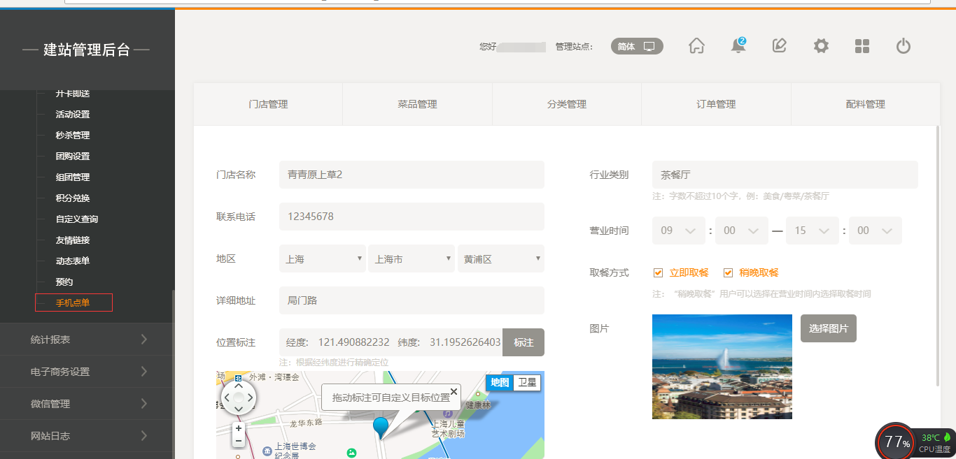 1.首先,點擊“后臺管理”-“手機點單”-“門店管理”-“添加門店”,填寫完店面信息之后,我們點擊保存即可(注:1.首先需要填寫店面的地址然后可以拖動地圖進行精確;2.店面最多添加5家店面),保存之后,我們添加菜品時有兩個入口,一個是店面所對應(yīng)的入口,一個是在菜品管理中可以選擇所屬店面,如圖所示: