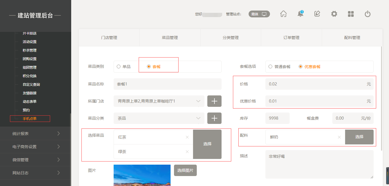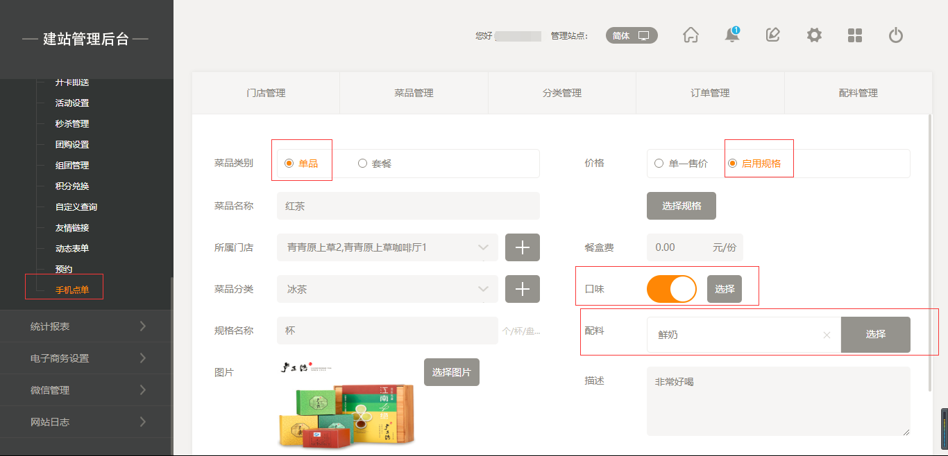 2.點擊“菜品管理”添加菜品,添加菜品時有兩種選項,一個是“單品”,另一個是“套餐”,當(dāng)點擊“套餐”時,我們選擇之前添加好的單品進行組合即可;當(dāng)添加菜品時,我們也可以給該菜品添加“口味”以及“配料”,同時我們也可以給該菜品進行“規(guī)格”設(shè)置,如“大杯”“小杯”等,在前端添加菜品時都會體現(xiàn)出來,填寫完成后點擊保存即可,如圖所示: