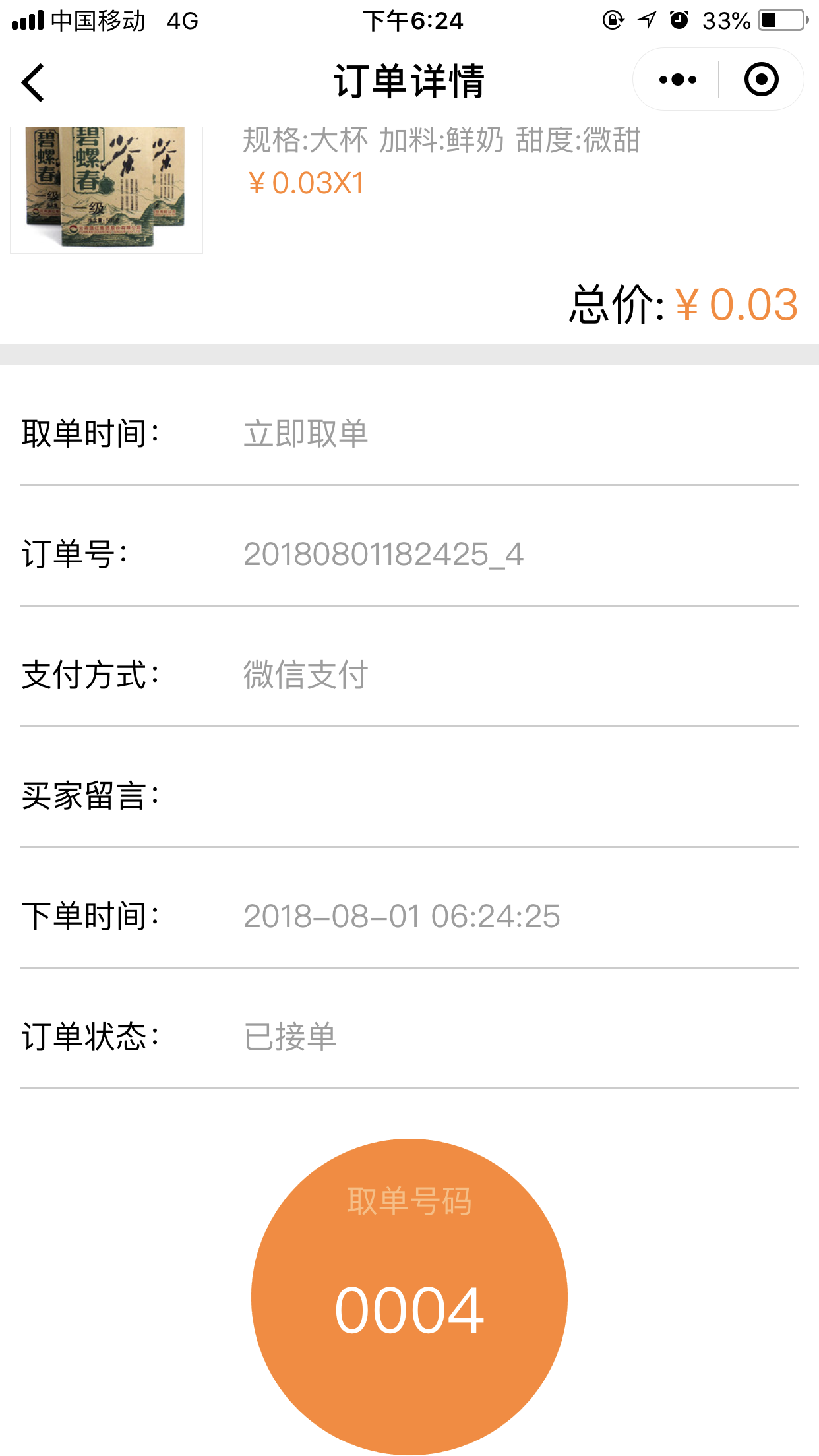 4.在前臺,用戶點擊“開始點單”可以根據(jù)位置匹配到最近的店面,并且可以選擇取餐的方式“立即取餐”或“稍晚取餐”,進入點單列表頁我們添加菜品時,可以選擇我們在后臺添加的“配料”、“口味”、以及“規(guī)格”等,選擇完畢之后,點擊“去結(jié)算”跳轉(zhuǎn)到提交訂單頁面,取單時間根據(jù)用戶的選擇會顯示為“立即取單”或者為“取單的時間點”,提交訂單后,會跳轉(zhuǎn)到“訂單詳情”頁面,當(dāng)商家在后臺點擊“接單”接單后,會有“取餐碼”顯示出來,如圖所示: