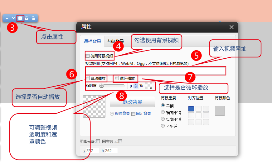 ①.拖出通欄插件,點擊屬性,可以勾選背景視頻。通欄背景和內容背景均可設置視頻,通欄背景視頻的最大寬度是頁面寬度,而內容背景視頻的最大寬度是內容寬度。