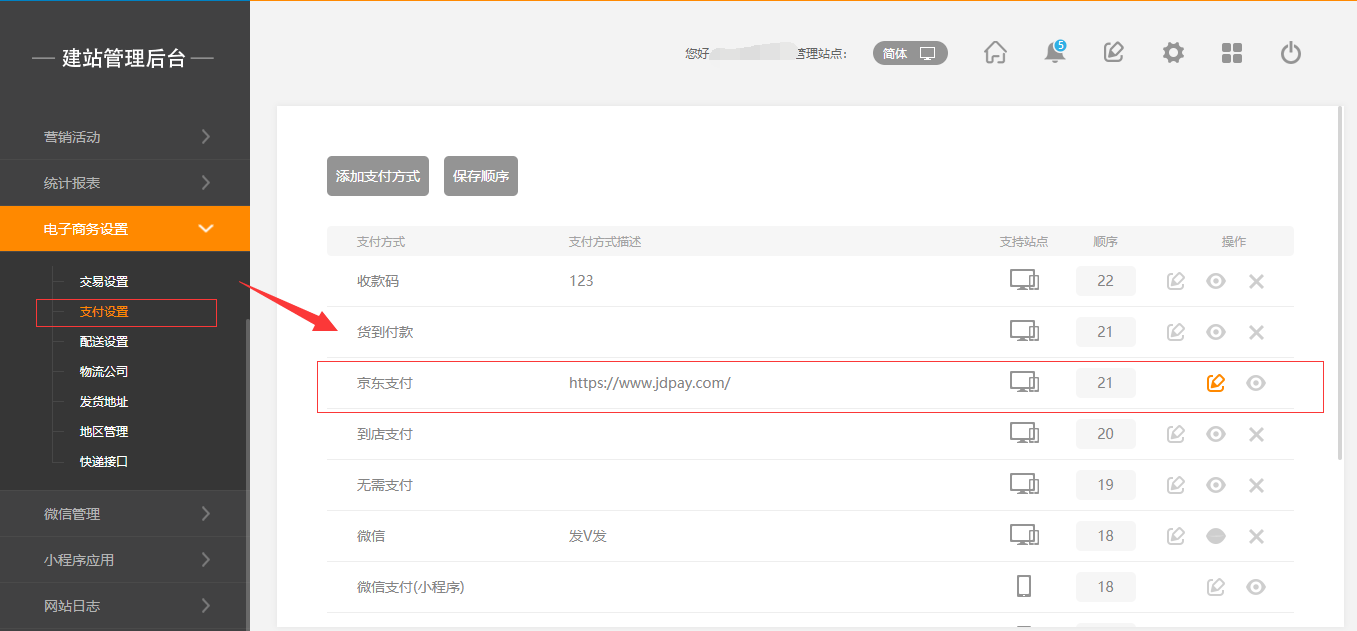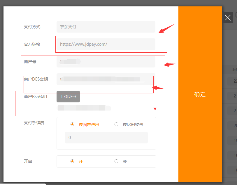 后臺-“電子商務(wù)設(shè)置”-“支付設(shè)置”-“京東支付”,點擊“編輯”,通過官方鏈接進行商戶賬號申請后(注:請選擇快捷支付)根據(jù)京東支付網(wǎng)站中申請?zhí)崾具M行操作,將得到的商戶號、密鑰等信息填寫完全,并上傳證書后將其開啟,點擊保存即可,如圖所示: