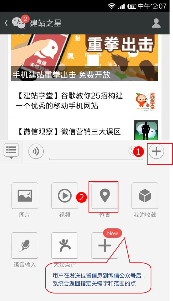 用戶在發(fā)送位置信息到微信公眾號后,系統(tǒng)會返回指定關(guān)鍵字和范圍的點