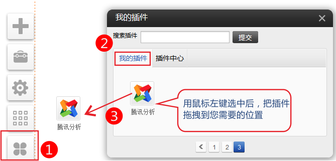 2,依次點(diǎn)擊插件-我的插件-選中“騰訊分析”插件拖拽到您需要的位置。(如果“我的插件”中沒(méi)有,請(qǐng)到插件中心選啟用)