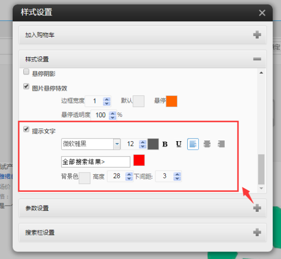 ⑦.點擊結(jié)果插件的樣式設(shè)置,可以設(shè)置樣式。和產(chǎn)品列表一樣,可以選擇加入購物車等