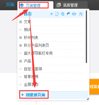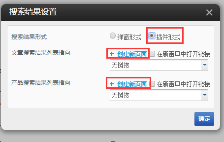 ④.點擊下圖中的創(chuàng)建新頁面,系統(tǒng)將自動創(chuàng)建一個帶有文章搜索結(jié)果插件或者產(chǎn)品搜索結(jié)果插件的頁面。