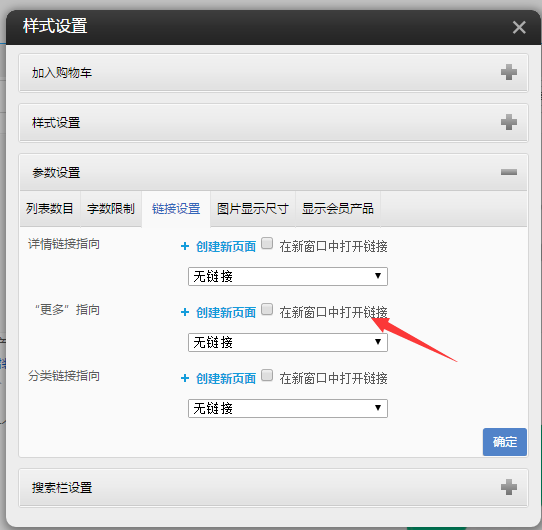 ⑧.需要注意的是,點擊參數(shù)設(shè)置,設(shè)置列表的鏈接指向,如下,需要鏈接到帶有產(chǎn)品詳情插件的頁面。其余的列表數(shù)目,字?jǐn)?shù)限制,圖片顯示尺寸,顯示會員產(chǎn)品可自行按需設(shè)置