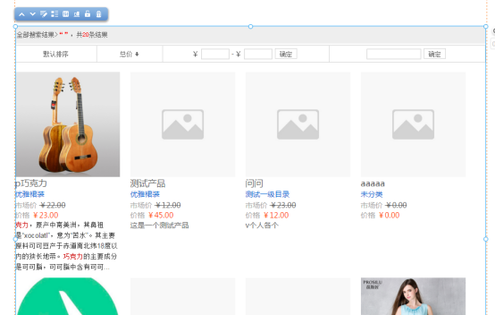 ⑥.產(chǎn)品搜索結(jié)果插件如下:編輯狀態(tài)下,將出現(xiàn)如下的插件,和產(chǎn)品列表的某個樣式一致。注意,預(yù)覽情況下默認(rèn)該插件是沒有數(shù)據(jù)的,只能和搜索框聯(lián)配合使用