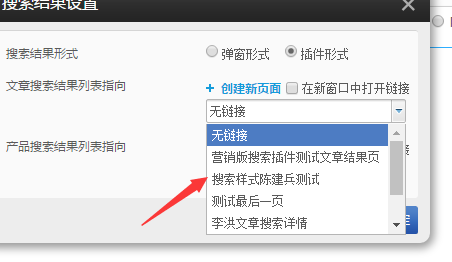 選擇了插件形式之后,需要設(shè)置文章搜索列表結(jié)果和產(chǎn)品搜索結(jié)果列表的鏈接。