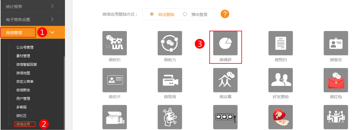 1、依次點擊 微信管理-》微信應(yīng)用-》微調(diào)研