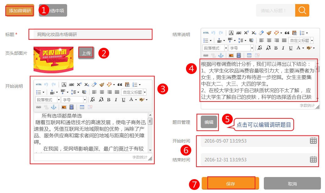 2、添加微調(diào)研、可以設(shè)置開始說明、結(jié)束說明、開始時間等、也可以編輯題目