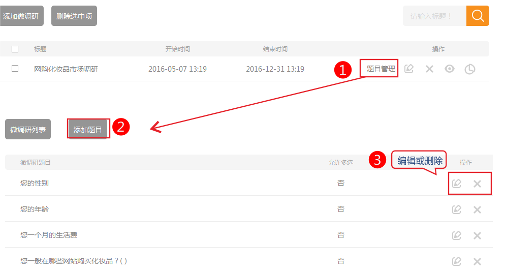 后臺:可以添加多個調(diào)研活動,自由編輯調(diào)研題目,可設(shè)定調(diào)研開始和結(jié)束時間,查看調(diào)研統(tǒng)計結(jié)果
