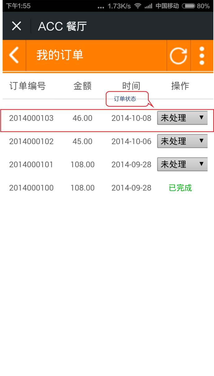 3)查看訂單詳情——點擊訂單后面的“查看 ”按鈕,進(jìn)入訂單詳情頁,可查看訂單的基本信息和菜品信息。