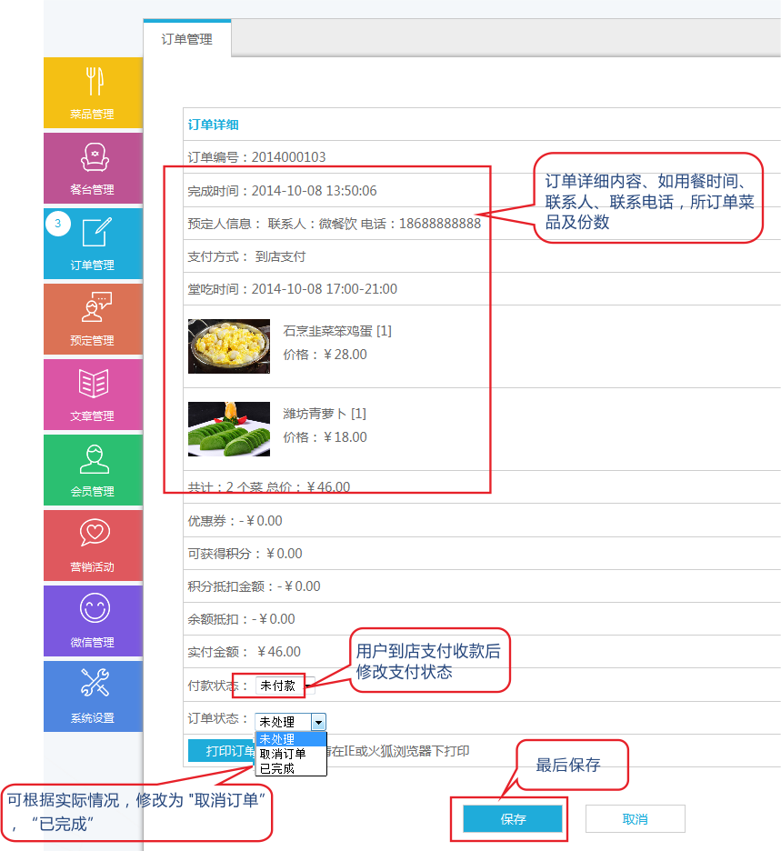 1)瀏覽訂單列表——點擊“訂單管理”,進(jìn)入訂單管理頁面。在訂單管理頁面,按訂單編號等進(jìn)行訂單的搜索查詢。對于不同狀態(tài)的訂單,可進(jìn)行“查看 ”、“打印小票 ”、等操作。