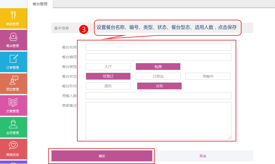 2.設(shè)置餐臺(tái)名稱、編號(hào)、類型、狀態(tài)、餐臺(tái)型態(tài)、適用人數(shù),點(diǎn)擊保存這樣前臺(tái)的預(yù)定餐臺(tái)功能就能實(shí)現(xiàn)啦