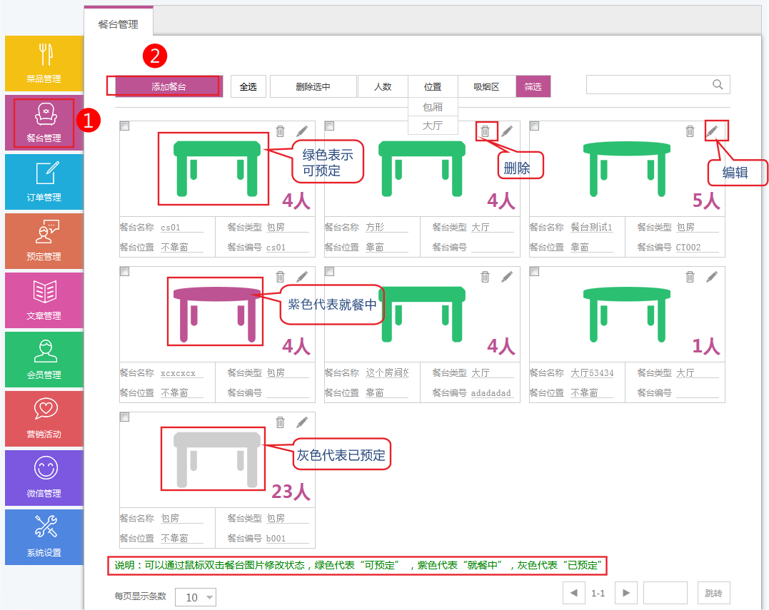 1.在餐臺(tái)管理可以添加、編輯、刪除餐臺(tái)并且可以改變餐臺(tái)狀態(tài)。