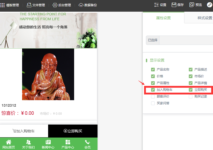 2、在前臺編輯頁面 產(chǎn)品詳情頁 -》屬性設(shè)置中勾選 加入購物車和立即購買。保存重新下載app然后上傳到小程序發(fā)布即可。