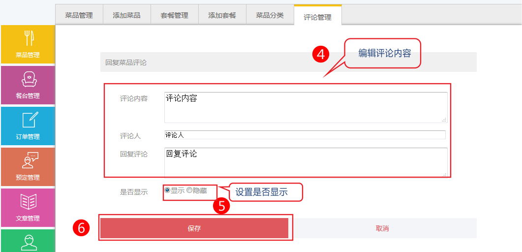 評論內(nèi)容顯示在菜品詳細(xì)頁,店主可以決定評論的是否顯示及回復(fù)。
