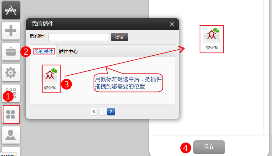 依次點擊插件-》我的插件-》用鼠標左鍵選中后,把插件拖拽到您需要的位置