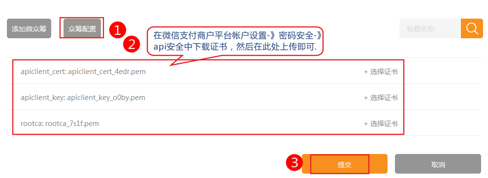 在微信支付商戶平臺帳戶設(shè)置-》密碼安全-》api安全中下載證書,然后在此處上傳即可.