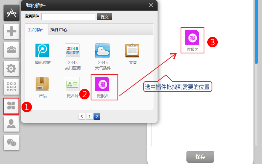4、?從左側(cè)的工具欄插件中,選中微報名插件后按住左鍵不放,然后把微報名插件拖拽到您需要的位置。(要使用該插件需要您先在插件中心啟用)?