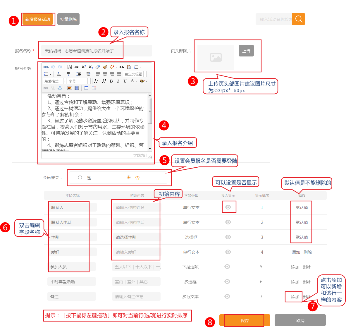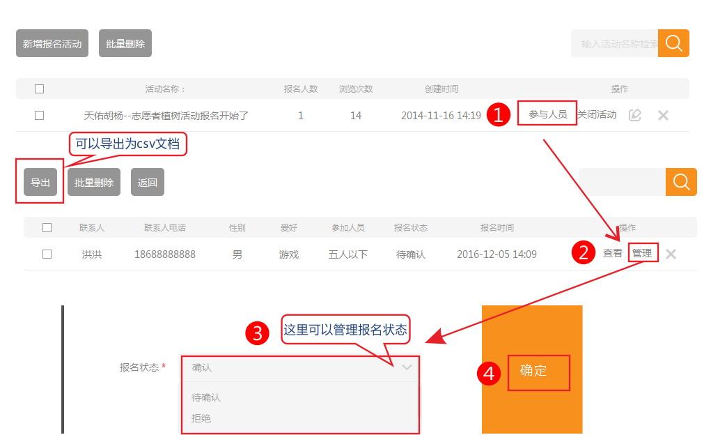 后臺:可以添加多個報名活動,自定義報名表單內(nèi)容,設(shè)定是否需要會員登錄,查看報名參加人員