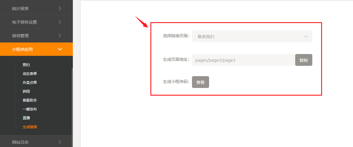 1.在建站后臺(tái),“小程序應(yīng)用”中,新增了“生成鏈接”功能,選擇頁(yè)面后,生成頁(yè)面地址一欄即自動(dòng)顯示出地址,小程序碼也會(huì)自動(dòng)生成。注:使用此功能需先配置好小程序ID和密鑰;小程序碼在小程序發(fā)布后才能看到。2.當(dāng)選擇的頁(yè)面中有產(chǎn)品詳情插件時(shí),可以選擇具體的產(chǎn)品來(lái)生成地址,如圖所示: