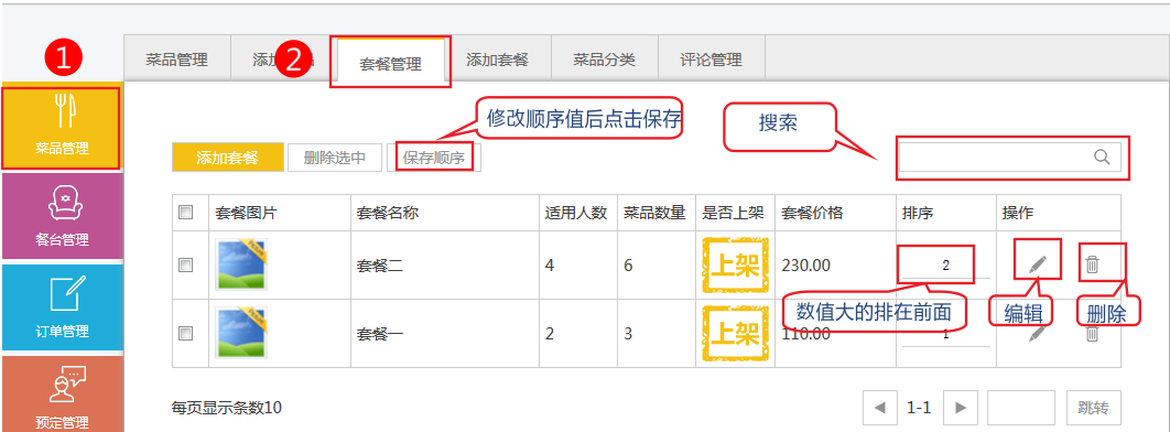 依次點(diǎn)擊“菜品管理”——“套餐管理”,實(shí)現(xiàn)添加套餐、設(shè)置顯示順序、編輯套餐,刪除套餐等功能