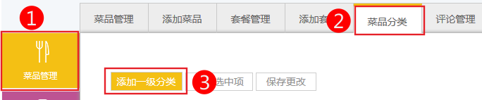 小節(jié)共包含5點(diǎn)。1、看完本節(jié)內(nèi)容您應(yīng)該知道: 添加菜品分類往往是第一步的,一個(gè)商品必須添加在一個(gè)分類下 添加分類以后,您可以對(duì)分類的順序進(jìn)行調(diào)整,讓您認(rèn)為重要的分類顯示在前面。 2、添加分類 1.依次點(diǎn)擊菜品管理-菜品分類 2.錄入頂級(jí)分類名稱。 如果還有添加頂級(jí)分類點(diǎn)擊添加一級(jí)分類即可 添加完完畢以后點(diǎn)擊保存更改,可以在分類列表中看到它 添加完完畢以后,可以在分類列表中看到它 3、調(diào)整分類的顯示順序 可能我們一開(kāi)始添加的順序,未必就是我們真正想要的顯示順序,特別是網(wǎng)站網(wǎng)頁(yè)顯示的分類順序,往往會(huì)根