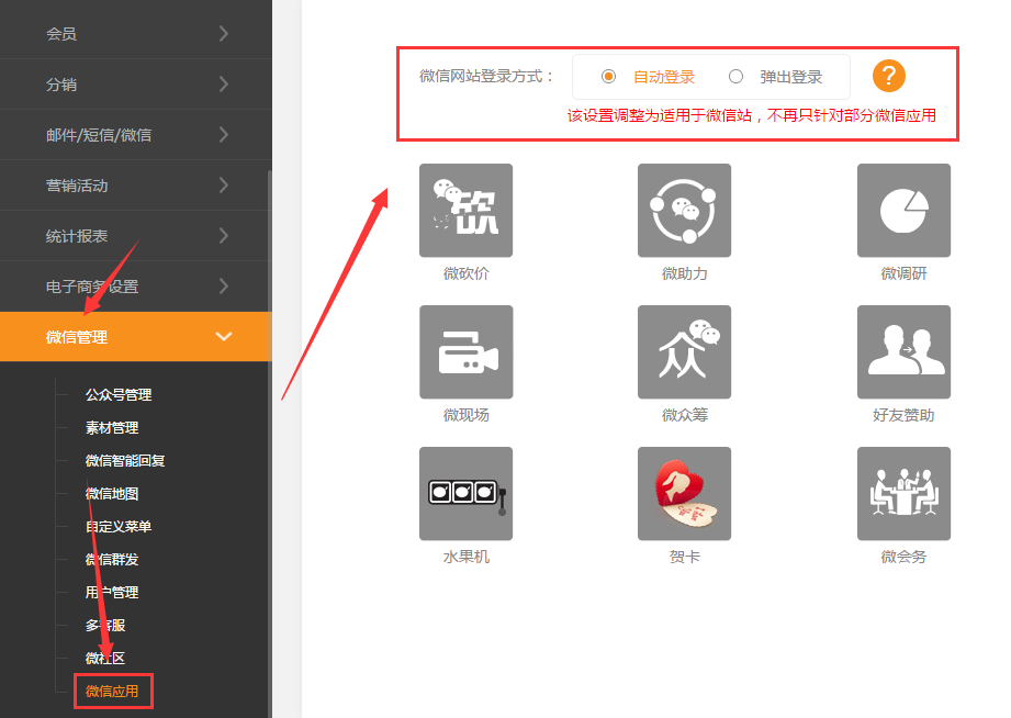 ??微信站可以設(shè)置自動登錄(營銷版)①.原本的微信應(yīng)用登錄方式設(shè)置改為針對微信站,默認是自動登錄,必須是認證過的服務(wù)號才可以使用此功能自動登錄:用戶在進入網(wǎng)站,系統(tǒng)會自動生成一個隨機賬號,用戶可以在會員中心---賬戶設(shè)置中進行修改,只能修改一次,請謹(jǐn)慎填寫賬戶名彈出登錄:就是目前需要輸入賬號和密碼的形式來登錄②.角色管理增加微信站登錄設(shè)置權(quán)限微信管理---微信應(yīng)用這塊,增加了微信網(wǎng)站登錄方式的權(quán)限?