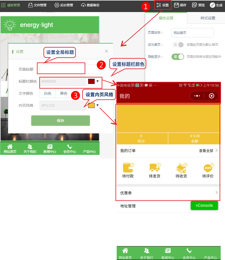 一、點擊設(shè)置可以設(shè)置頁面全局標(biāo)題、標(biāo)題欄顏色、文字顏色、和內(nèi)頁風(fēng)格。具體對應(yīng)如下圖:如果要設(shè)置單獨的頁面名稱在右側(cè)點擊設(shè)置即可