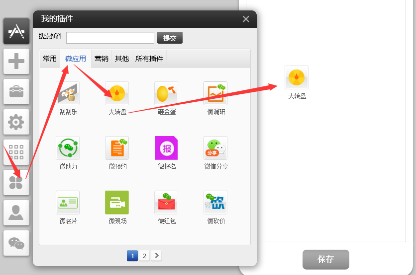 手機版插件適用版本(基礎(chǔ)版、標(biāo)準(zhǔn)版、營銷版)插件(僅手機版本支持)可以使用此插件進行營銷推廣,增加用戶粘性。在微信自定義菜單或關(guān)鍵詞回復(fù)里可以設(shè)置鏈接到含有砸金蛋插件的手機頁面,實現(xiàn)微信營銷活動。使用方法:進入網(wǎng)站編輯-〉點左側(cè)插件圖標(biāo)-〉我的插件-微應(yīng)用,找到大轉(zhuǎn)盤圖標(biāo),把插件拖拽到頁面中。設(shè)置活動內(nèi)容、規(guī)則中獎概率=某個獎項數(shù)量/max(每個賬號每天抽獎次數(shù)*所有獎項數(shù)量之和或每個賬號每天抽獎次數(shù)*活躍人數(shù))注:公式中的分母取A和B2者最大值A(chǔ)每個賬號每天抽獎次數(shù)*活躍人數(shù)B每個賬號每天抽獎次數(shù)*所有獎項數(shù)量