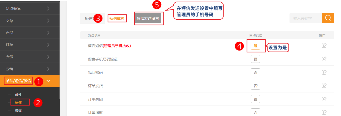 ?支持版本營銷版(僅支持新版留言)1、后臺----短信模板中,增加了【留言內(nèi)容】模板,開啟此模板2、開啟模板之后,并且要在短信發(fā)送設(shè)置中輸入管理員手機(jī)號碼,之后管理員可在手機(jī)上查看新留言3.短信可發(fā)送的內(nèi)容?