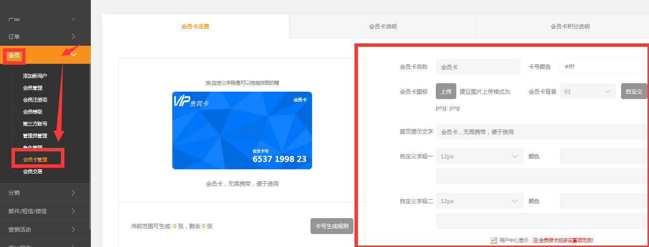依次點擊會員管理-》會員卡管理1.1可以設(shè)置會員卡名稱、卡號文字顏色、背景、logo、首頁提示文字、使用說明及積分說明等,設(shè)置后可生成完整的微信電子會員卡;對應(yīng)示例圖1.2卡號生成規(guī)則設(shè)置2、錄入會員卡說明3、錄入會員卡積分說明常見問題Q會員卡號能不能修改答:會員卡號描述文字不能修改最終解釋權(quán)也不能修改或去掉如何設(shè)置不在會員中心顯示會員卡請在網(wǎng)站后臺-》會員-》會員卡管理中把用戶中心顯示勾選去掉(注:會員領(lǐng)卡后該設(shè)置項無效!)
