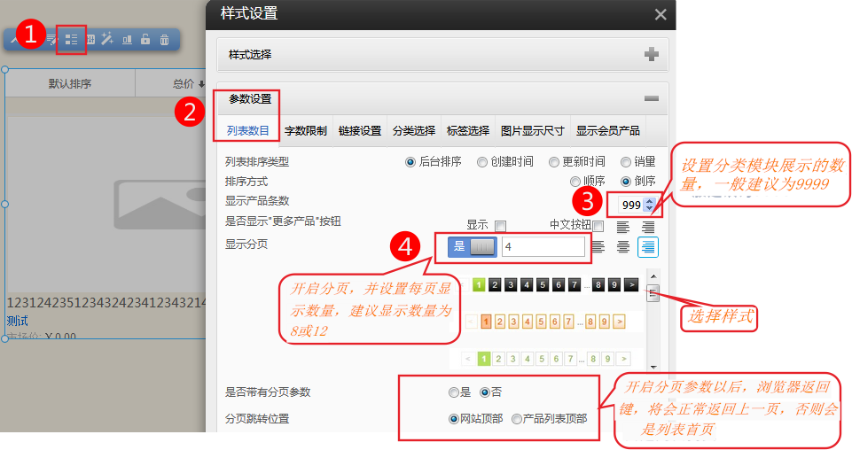 產(chǎn)品列表如何分頁?選中分類列表模塊、-》參數(shù)設(shè)置-》列有數(shù)目-》顯示分頁設(shè)置為是。