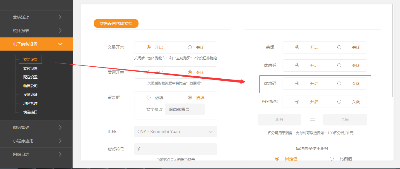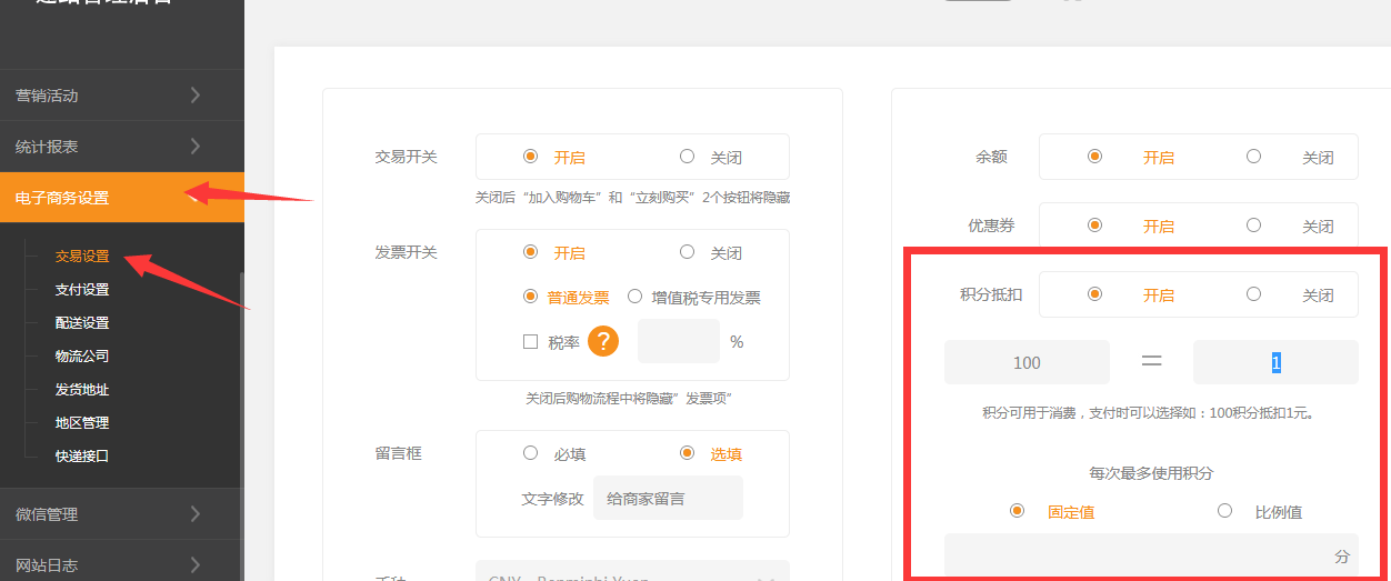 適用版本營銷版(pc、小程序、手機(jī))依次點擊系統(tǒng)設(shè)置-》積分抵扣-》設(shè)置抵扣規(guī)則積分可以用來消費,訂單支付的時候用戶可以選擇使用積分支付,本例設(shè)置的是100積分抵扣1元。積分消費也還會送積分