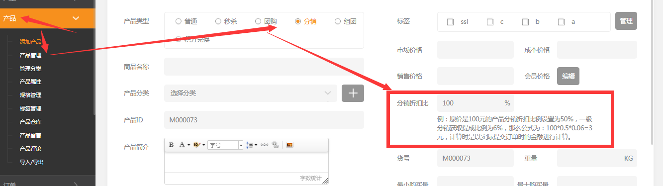 支持不同商品的一級分銷和二級分銷不同比例嗎?答:支持后臺添加產(chǎn)品中分銷折扣比例的作用是什么。例原價是100元產(chǎn)品分銷折扣比例設(shè)置為50%一級分銷獲取提成比例為6%那么公式為100*0.5*0.06=3元