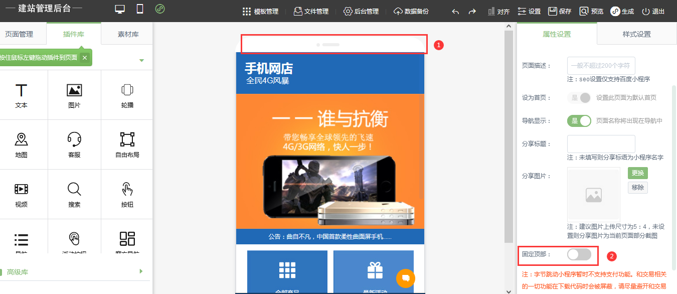 1.選中頁面頂部空白部份然后在右側(cè)勾選固定頂部2.然后設(shè)置頂部的最小高度再把需要的插件拖拽到頂部區(qū)域中,注意需要拖拽新插件。