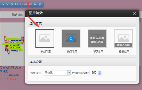 可用版本:基礎(chǔ)版,標(biāo)準(zhǔn)版,營(yíng)銷版 目前可以使用此功能的插件:圖片,圖文,文章列表,產(chǎn)品列表,團(tuán)購(gòu)列表,秒殺列表,積分列表 ①.以產(chǎn)品列表為例,拖出產(chǎn)品列表到編輯區(qū)域,點(diǎn)擊圖片特效按鈕 ②.提供了如下四種樣式的圖片特效,選擇單圖效果,在樣式設(shè)置中的效果樣式可以選擇某一種,鼠標(biāo)懸停圖片,圖片將出現(xiàn)對(duì)應(yīng)的效果 ③.焦點(diǎn)效果:鼠標(biāo)懸停,圖片出現(xiàn)遮罩層,并且可以替換中間的圖標(biāo) 背景效果:選擇遮罩的彈出動(dòng)畫 更改圖標(biāo):更換圖標(biāo),大小為42px*42px 背景設(shè)置:可以更改遮罩的顏色和透明度 ④
