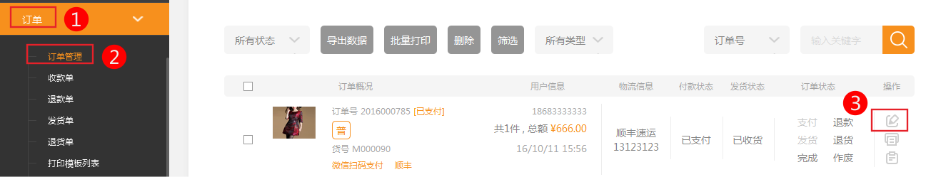訂單生成后,有時(shí)要對(duì)此訂單進(jìn)行編輯,比如修改自動(dòng)計(jì)算的運(yùn)費(fèi),修改商品數(shù)量,然后顧客再付款。訂單編輯是訂單處理中很重要的一部分。本小節(jié)共包含3點(diǎn)。1、通過本部分的操作,您可以方便的對(duì)訂單進(jìn)行編輯。選擇訂單編輯訂單綜合信息編輯訂單收貨人信息訂單生成后,再對(duì)訂單進(jìn)行修改,是頻率比較高的操作,接下來根據(jù)一個(gè)實(shí)例來說明如何修改訂單信息2、查看訂單列表,選擇要編輯的訂單注意:訂單中有編輯按鈕的才可以進(jìn)行編輯操作,如果沒有則說明此訂單已經(jīng)付款、完成或作廢,不能再編輯。3、編輯訂單綜合信息1訂單可以漲價(jià)或者折扣,漲價(jià)