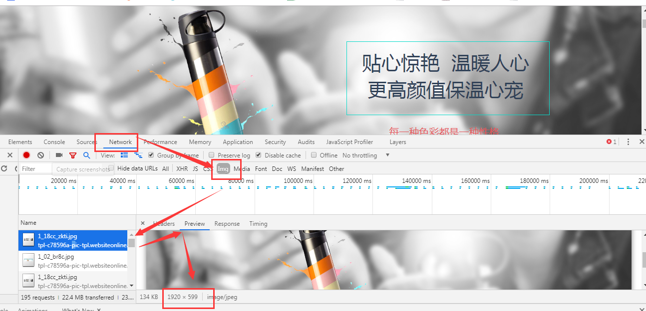 用chrome瀏覽器打開網(wǎng)站,然后在瀏覽器中按下f12出現(xiàn)下圖,刷新頁面切換到network查看img分類然后找到對(duì)應(yīng)的圖片查看尺寸下面的1920*599就是圖片的尺寸單位是px