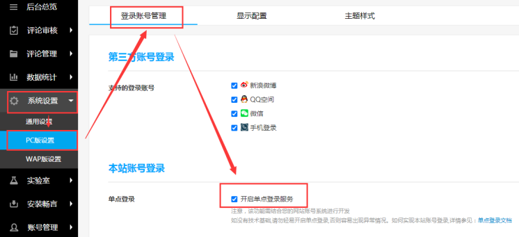 登錄暢言云評(píng)后臺(tái)(http://changyan.kuaizhan.com/setting/pc/single_sign)進(jìn)行如下設(shè)置1開啟單點(diǎn)登錄2填寫相關(guān)配置,保存即可2.1打開新頁面登錄2.2js彈窗登錄,其他配置同打開頁面登錄填寫cypopLogin()3演示效果3.1PC端3.1.1登錄3.1.2登出3.2手機(jī)端3.2.1登錄3.2.2登出(本站點(diǎn)登出,暢言不會(huì)同時(shí)登出;暢言登出,本站點(diǎn)同時(shí)登出)注意點(diǎn)1.開啟單點(diǎn)登錄后,原暢言云評(píng)用戶賬號(hào)將會(huì)變成本站點(diǎn)的用戶賬號(hào),相當(dāng)于新用戶,但是原暢言云評(píng)用戶賬號(hào)數(shù)據(jù)沒有刪除,關(guān)閉單點(diǎn)登錄,原暢言云評(píng)用戶賬號(hào)自動(dòng)還原。2.在暢言云評(píng)個(gè)人中心用戶不可修