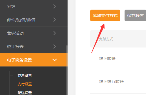 自建支付方式新增了掃碼和銀行轉(zhuǎn)賬兩種類型 一.建站之星自建支付方式新增了掃碼和銀行轉(zhuǎn)賬兩種類型 ①.后臺(tái)---電子商務(wù)設(shè)置---支付設(shè)置,點(diǎn)擊添加支付方式 ②.增加了收款碼和銀行轉(zhuǎn)賬 收款碼方式:管理員可以上傳微信或者支付寶的收款碼,這樣在提交訂單的時(shí)候,用戶可以掃描收款碼付錢。會(huì)出現(xiàn)在用戶提交訂單之后的頁面 銀行轉(zhuǎn)賬:提供收款的銀行賬號(hào)的相關(guān)信息,會(huì)出現(xiàn)在用戶提交訂單之后的頁面 勾選:用戶可以勾選以確定前臺(tái)是否顯示 商家說明:管理員可以對(duì)這兩種付款方式加以描述,會(huì)出現(xiàn)在付款信息頁面的下方 Ps:這