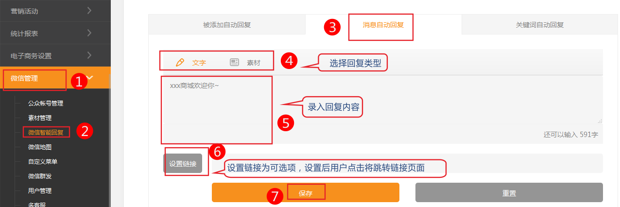 在微信公眾平臺設(shè)置用戶消息回復(fù)后,會在粉絲給您發(fā)送微信消息時,會自動回復(fù)您設(shè)置的文字/圖片給粉絲。設(shè)置方法:通過在微信管理=》微信智能回復(fù)=》消息自動回復(fù),可設(shè)置的文字/圖片為用戶消息回復(fù)。溫馨提示:消息自動回復(fù):1個小時內(nèi)回復(fù)1—2條內(nèi)容;手機(jī)微信中效果:設(shè)置文字鏈接為可選項,設(shè)置后用戶點(diǎn)擊將跳轉(zhuǎn)鏈接頁同圖片支持JPG、PNG格式,較好的效果為大圖360*200,小圖200*200