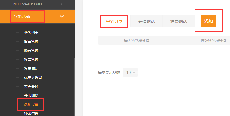 如何設(shè)置簽到分享1、依次點(diǎn)擊營銷活動-》活動設(shè)置-》簽到分享-》添加2、設(shè)置簽到分享贈送積分的額度,用戶通過簽到或分享則可獲得對應(yīng)的積分注:“簽到”一天僅可一次。分享和轉(zhuǎn)發(fā)產(chǎn)品詳情和文章詳情,24小時內(nèi)同一產(chǎn)品和文章只增加一次積分,(同一產(chǎn)品,分享獲取一次,然后轉(zhuǎn)發(fā)還可以獲取一次)不同的產(chǎn)品和文章分享的積分可以累加。如果超過了“每日分享和轉(zhuǎn)發(fā)積分上限”則當(dāng)日轉(zhuǎn)發(fā)或分享都不能再獲得到積分簽到獎勵如果用戶連續(xù)簽到5天獎勵10積分。之后是新的一個輪回。說明:本活動設(shè)置的獎勵積分僅限在微信中分發(fā),才可以獲得本活動