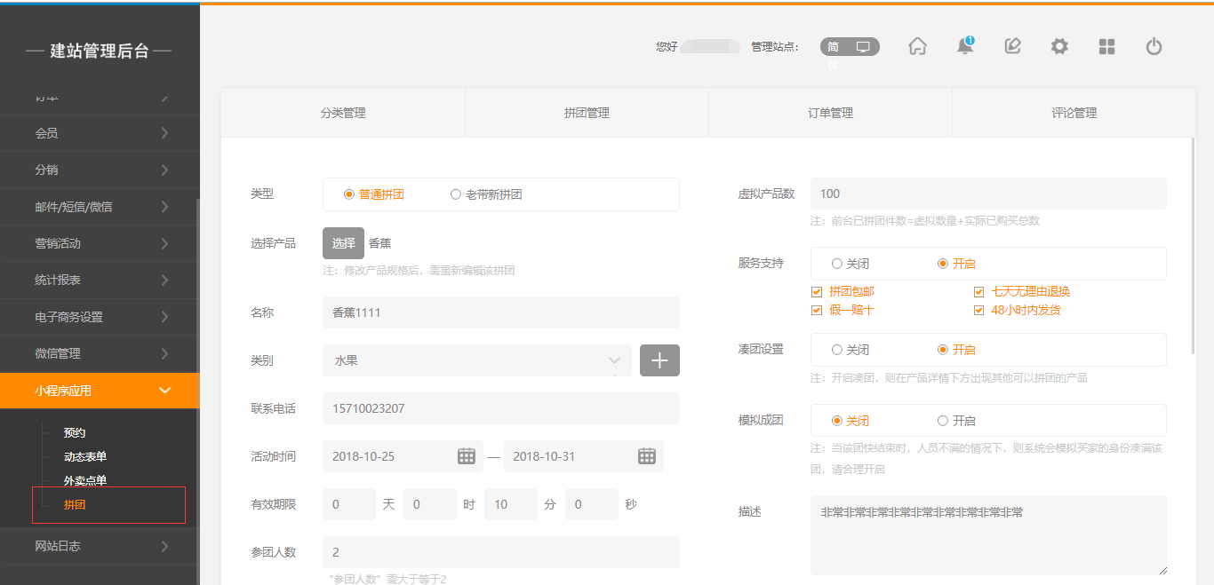 注意:支付時不支持余額,積分、優(yōu)惠券。會員等級也無效1.點(diǎn)擊建站后臺“小程序應(yīng)用”-“拼團(tuán)”-“創(chuàng)建拼團(tuán)”,填寫拼團(tuán)的信息。拼團(tuán)的類型有“普通拼團(tuán)”也就是任何人可以開團(tuán),同時任何人都可以參團(tuán); “老帶新拼團(tuán)”是任何人都可以開團(tuán),但是只有拼團(tuán)訂單中沒有過記錄的客戶可以參團(tuán)。選擇好類型之后,選擇拼團(tuán)的產(chǎn)品,該產(chǎn)品都是之前在后臺添加好的產(chǎn)品,每個拼團(tuán)只可選擇一種,填寫其他信息,填寫完畢后,點(diǎn)擊保存即可,如圖所示:2.在小程序編輯器中,拖入“拼團(tuán)列表”以及“拼團(tuán)詳情”,在“屬性設(shè)置”與“樣式設(shè)置”中