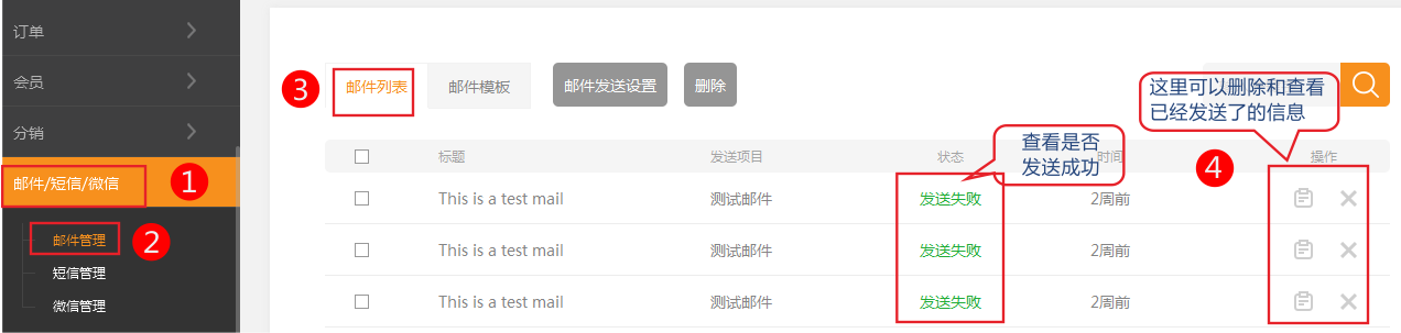 郵件列表 您可以通過郵件列表查看已經(jīng)發(fā)送了的郵件及是否發(fā)送成功。您還可以刪除已經(jīng)發(fā)送了的郵件。 依次點(diǎn)擊郵件-》郵件列表可以查看和刪除已經(jīng)發(fā)送的郵件列表