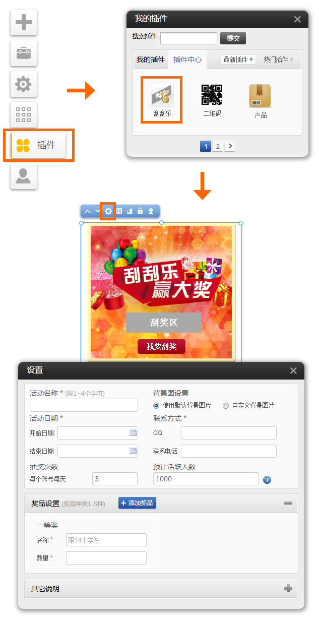 手機版插件(適用版本基礎(chǔ)版、標準版、營銷版) 刮刮樂插件 使用方法:進入網(wǎng)站編輯-〉點左側(cè)插件圖標-〉插件中心,找到刮刮樂圖標,點啟用 可以使用此插件進行營銷推廣,增加用戶粘性。 在微信自定義菜單或關(guān)鍵詞回復里可以設(shè)置鏈接到含有刮刮樂插件的手機頁面,實現(xiàn)微信營銷活動。 中獎概率=某個獎項數(shù)量/max(每個賬號每天抽獎次數(shù)*所有獎項數(shù)量之和或每個賬號每天抽獎次數(shù)*活躍人數(shù)) 注:公式中的分母取A和B2者最大值 A每個賬號每天抽獎次數(shù)*活躍人數(shù) B每個賬號每天抽獎次數(shù)*所有獎項數(shù)量之和 中獎信息 請在后臺